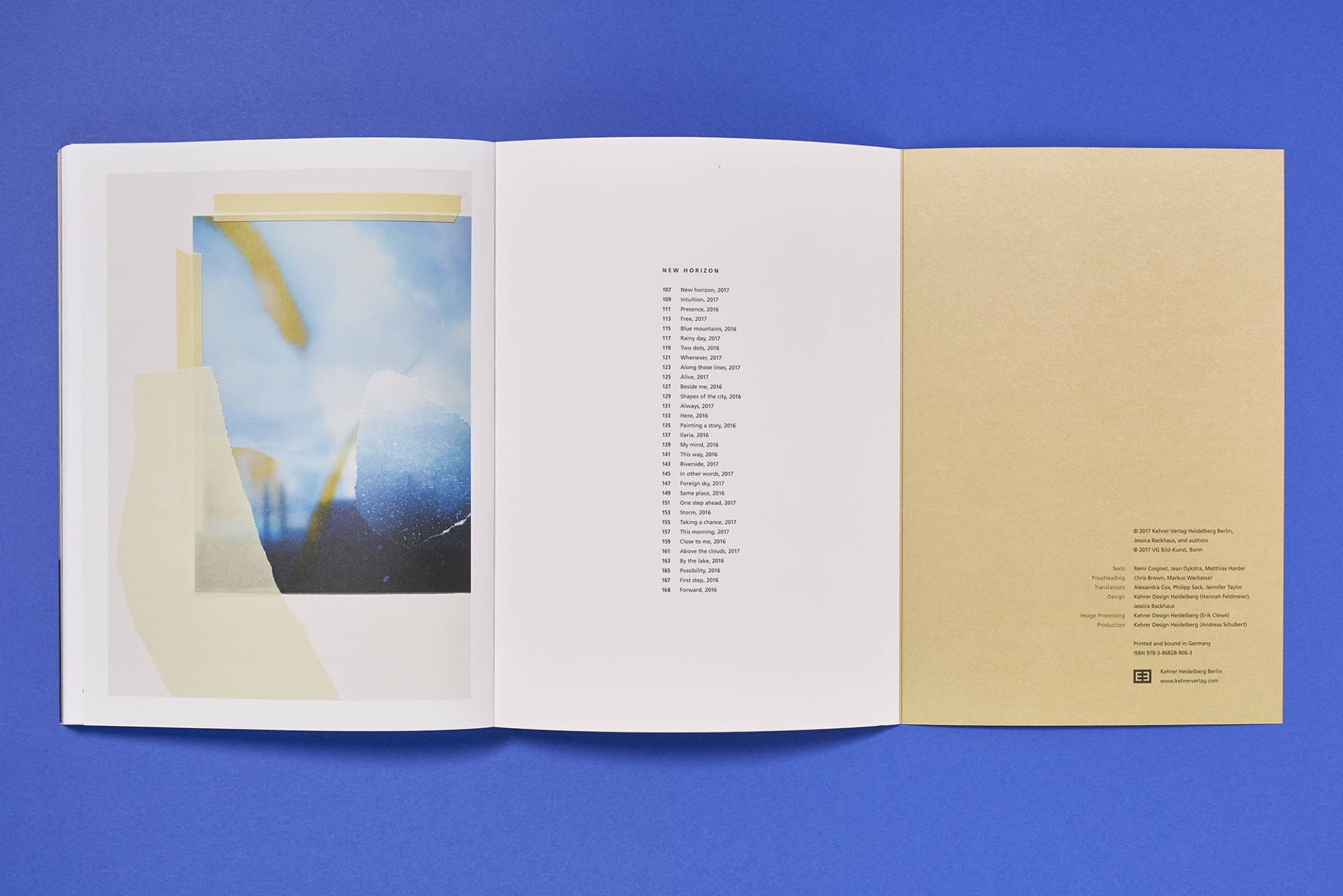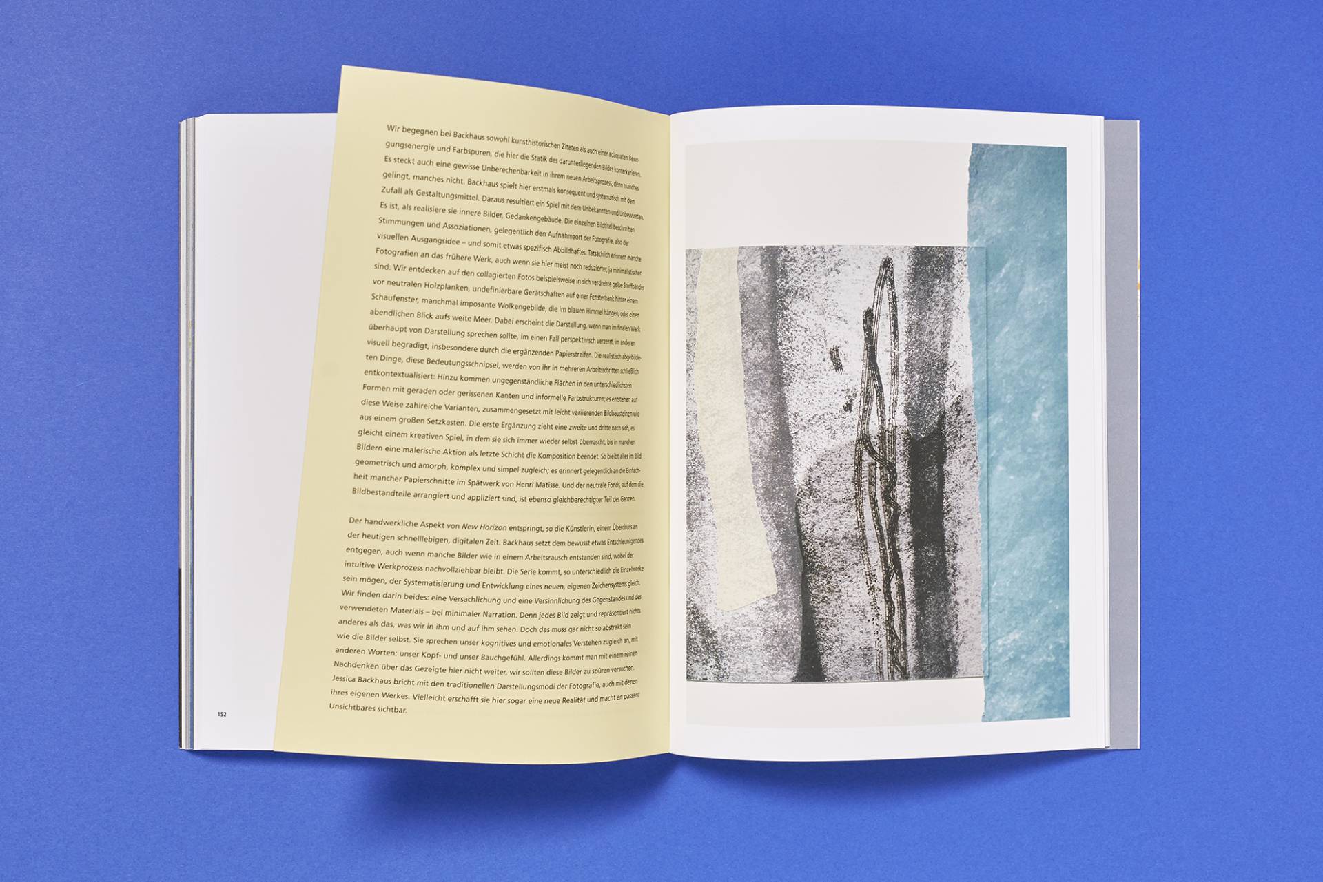 Jessica Backhaus embarks on her work with an obvious relish in experimentation. The photo artist draws inspiration from the simplicity of everyday things, from unassuming scenes and silence. The artist’s new trilogy brings together three series of approximately 40 works each. The first series, Beyond Blue, is devoted completely to colorful threads, staged against colored backgrounds. The viewer feels compelled to linger in this radical reduction, trying to unravel the entanglement of the seemingly unspectacular with the resulting aura of contemplation. In Shifting Clouds, Backhaus considers and documents this very transition – a reality that lies in between things. The second series shows fragments and visions that are poised on the verge of becoming, caught in limbo: reflections, haptically appealing surfaces, shapes imaginatively metamorphosing, upbeat tones, intensely colored sensations. In the third series, New Horizon, the artist presents free-flowing and persuasive poetic impressions. The compositions captivate with their variety and puzzle-like elements. Backhaus is breaking new ground in photography, incorporating components of mixed media, painting, and collage that expand and deepen these abstractions.