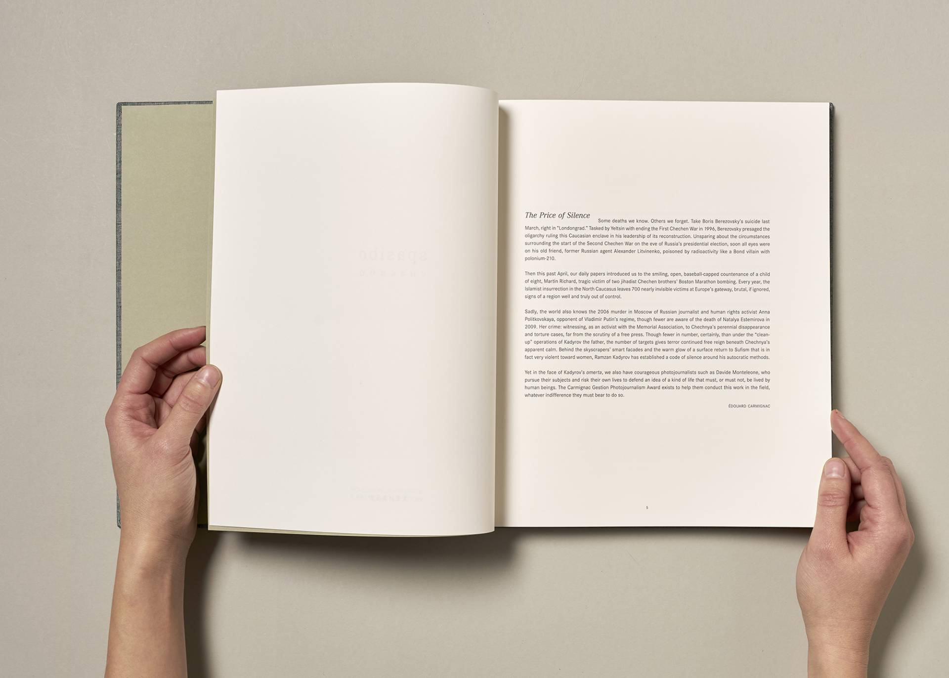 Today Chechnya is an autonomous republic in the Russian Federation, subdued and pacified by force after centuries of rebellion against Moscow. Putin protégé president Ramzan Kadyrov holds absolute power and has almost limitless support from Moscow. "Davide Monteleone is well acquainted with the complex, tormented life of ordinary Chechens. He has crisscrossed the country, stopping in cities and villages, mountains and forests. This book contains neither majestic city- or country-scapes nor bloodspattered depictions of violence. Monteleone rather shows us the otherwise invisible: the stifling atmosphere, the regnant helplessness and fear, the young women resigned to their fate, and the elderly, whose traditional authority has diminished in the face of Kadyrov's brutes. But Monteleone's photographs also depict hope. Chechens are a mountain people who have endured wars and other atrocities for centuries, including the collective deportation to the arid Kazakh steppes and to Siberia under Stalin in 1944. They know how to resist, and they know when to wait. Strong by nature, they are able to laugh even amidst adversity, and they sustain a birthrate that repopulates the land and replaces the dead. They know perfectly well that this dictatorial regime will fall sooner or later, as it has in other Muslim countries." Galia Ackerman Davide Monteleone (b. 1974) started his career in 2000, when he became an editorial photographer for the Contrasto agency. The next year he moved to Moscow as a correspondent. This decision determined his ensuing career. Since 2003, Monteleone has lived between Italy and Russia, pursuing long-term personal projects. He published his first book Dusha, Russian Soul in 2007, followed by La Linea Inesistente in 2009, and Red Thistle in 2012. His projects have brought him numerous awards, including various World Press Photo prizes and several grants like "Aftermath" and the European Publisher Award. Recently, alongside the projects Monteleone has carried out or leading international magazines, foundations, and cultural institutions, he has been involved with exhibiting his work, teaching, and shooting short films. Since 2011 Davide has been a member of VII Photo. In 2009, Carmignac Gestion broadened its corporate sponsorship activities to include support for photojournalism. Under the leadership of Nathalie Gallon, the Foundation annually finances an in-depth photo reportage on a topic directly connected to current affairs: The Carmignac Gestion Photojournalism Award. The first awards went to photographers covering the Gaza Strip, Pashtunistan, Zimbabwe, and Chechnya. Iran is the subject for 2013.
