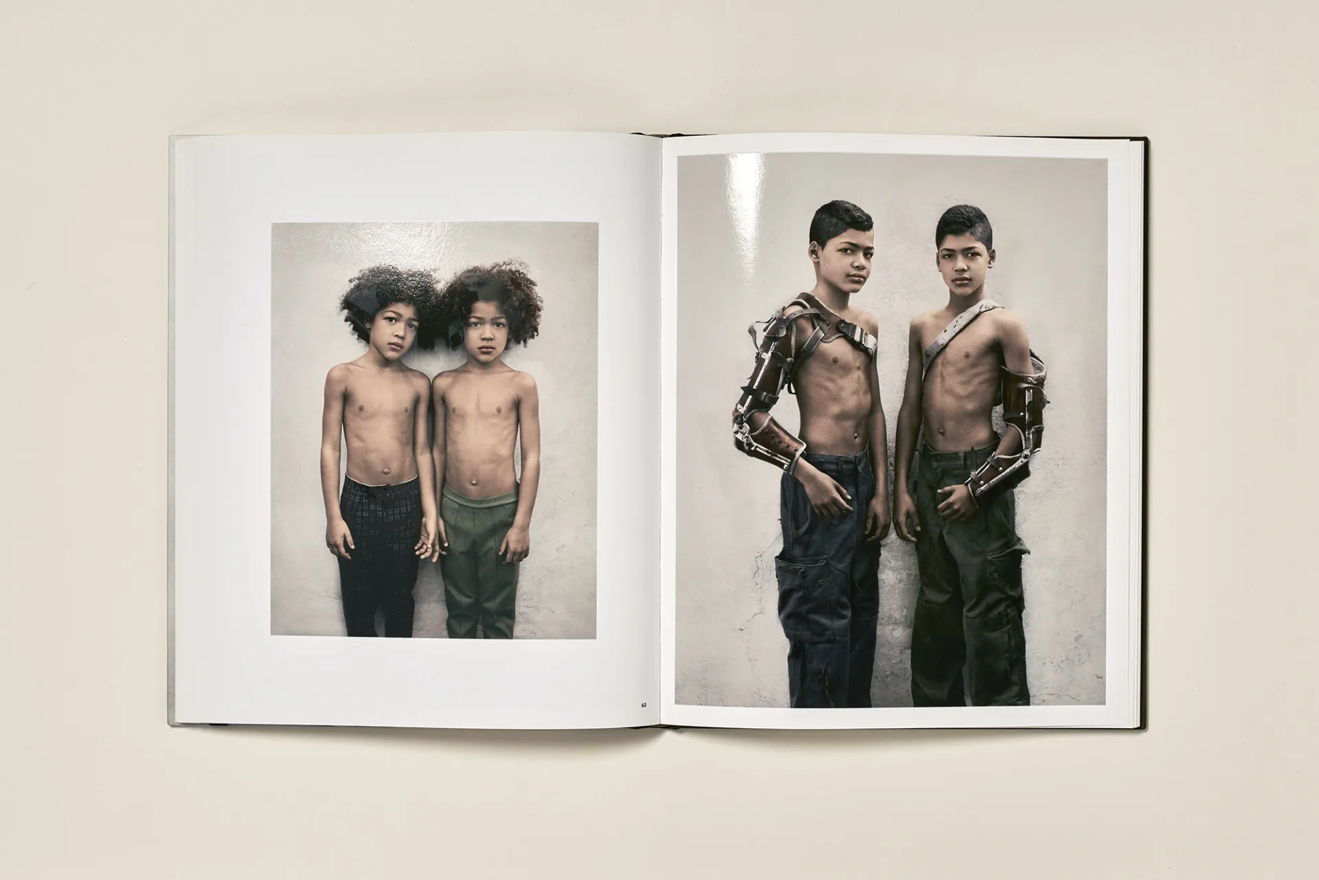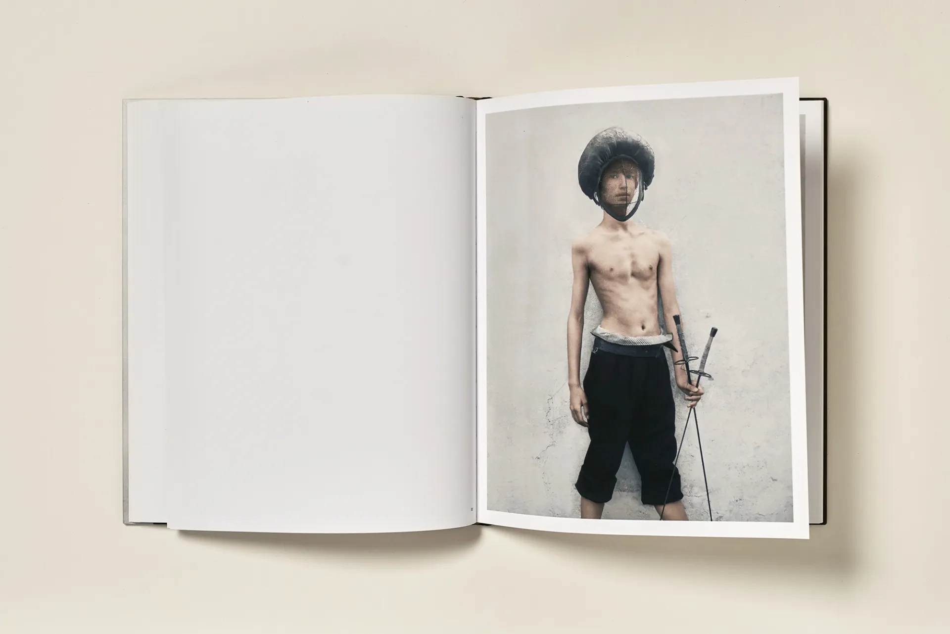 "A young, bare-chested sailor, his hands in the pockets of his white pants. His skin is smooth, pale, perfect. The nose is straight, the lips flush. Underneath the cap, his hair is short, black, strong. He is looking to the East; life lies before him. His beauty is unfathomable, sublime because it will last but an instant – a few months, maybe a few hours. Vee Speers eternalizes this moment of fragile adolescent beauty. She photographs the time before first loss, the time of childhood. She captures this in the bodies and faces. And she creates a world layered upon a world, of characters upon children who are no longer children. She dresses, styles, costumes, sometimes masks them. (...) Each and every one, in their manner and in their costume, is invincible. Each and every one holds the reins, dictates the rules. All is done. Certainly, Vee Speers has already photographed this band of heroes and heroines, has already had them play roles, against the same grey wall, six years earlier, when the adolescents were nothing more than children. Children who had just left a birthday party, dressed in their disguises of the little raven, the dancer in the tutu, the wounded boxer, the doll killer." (Julie Estève)