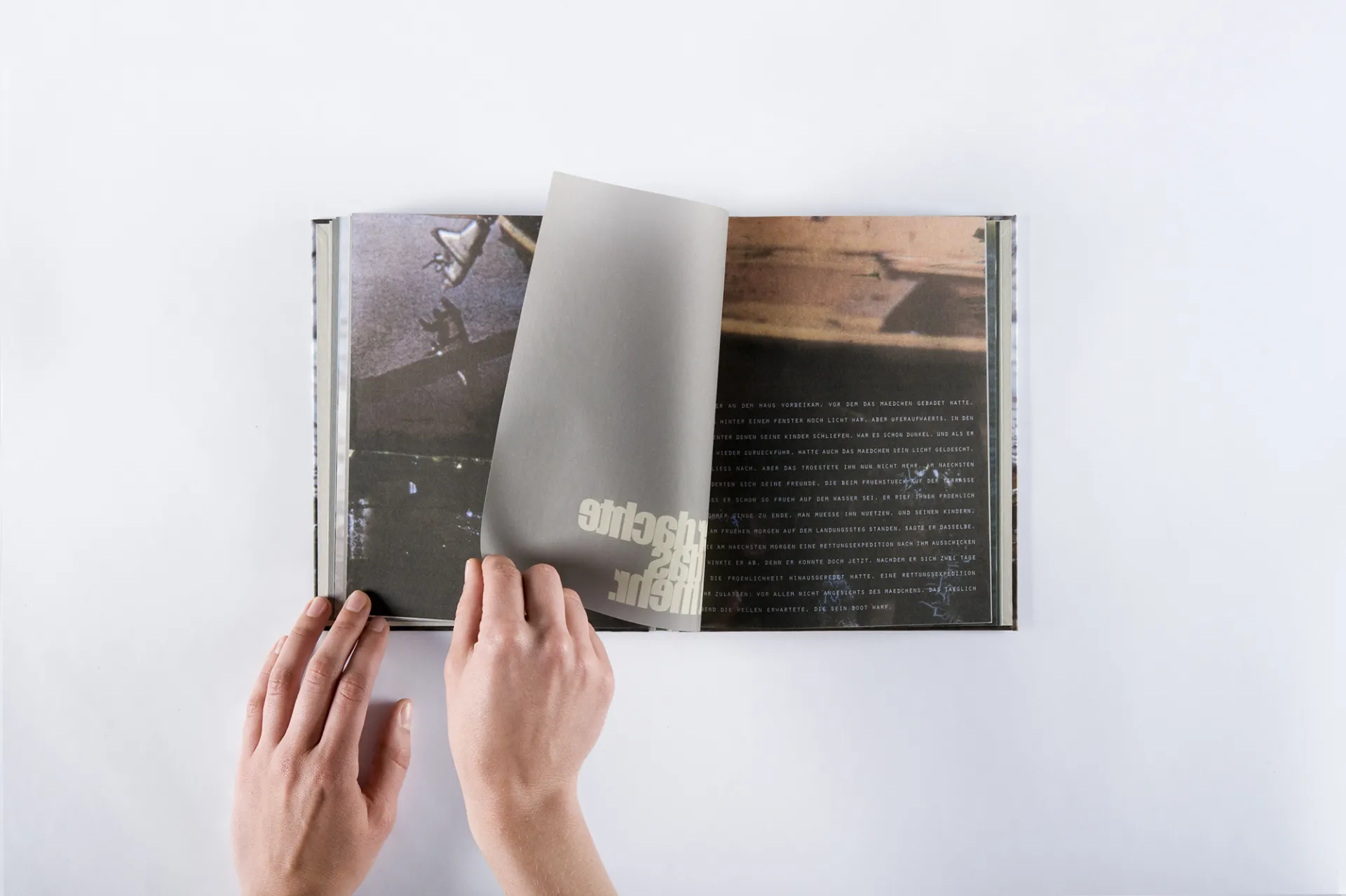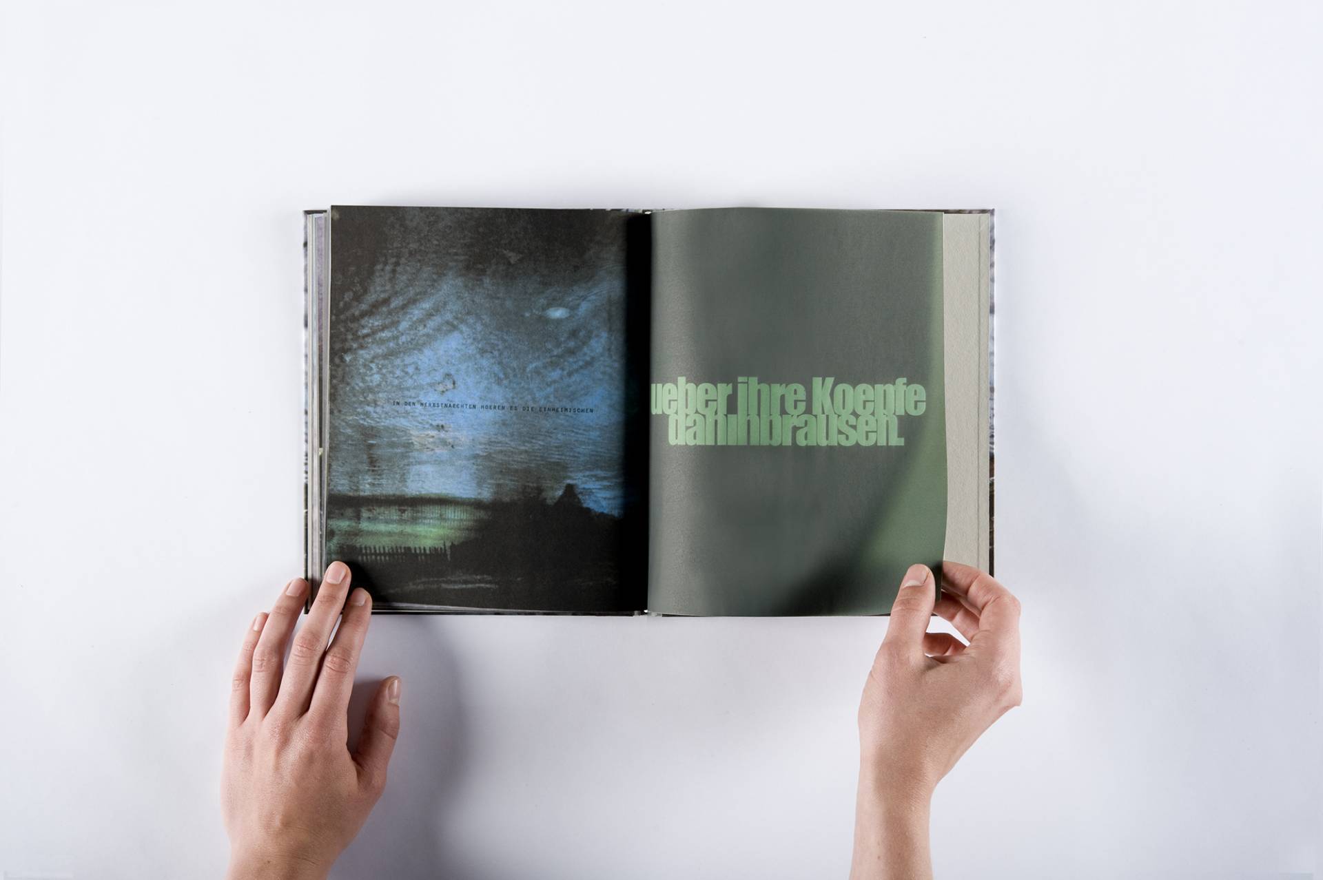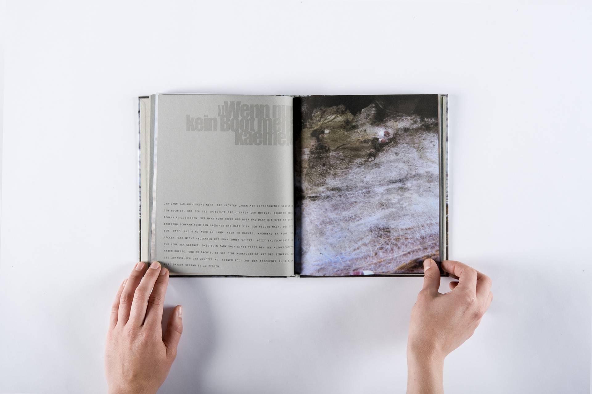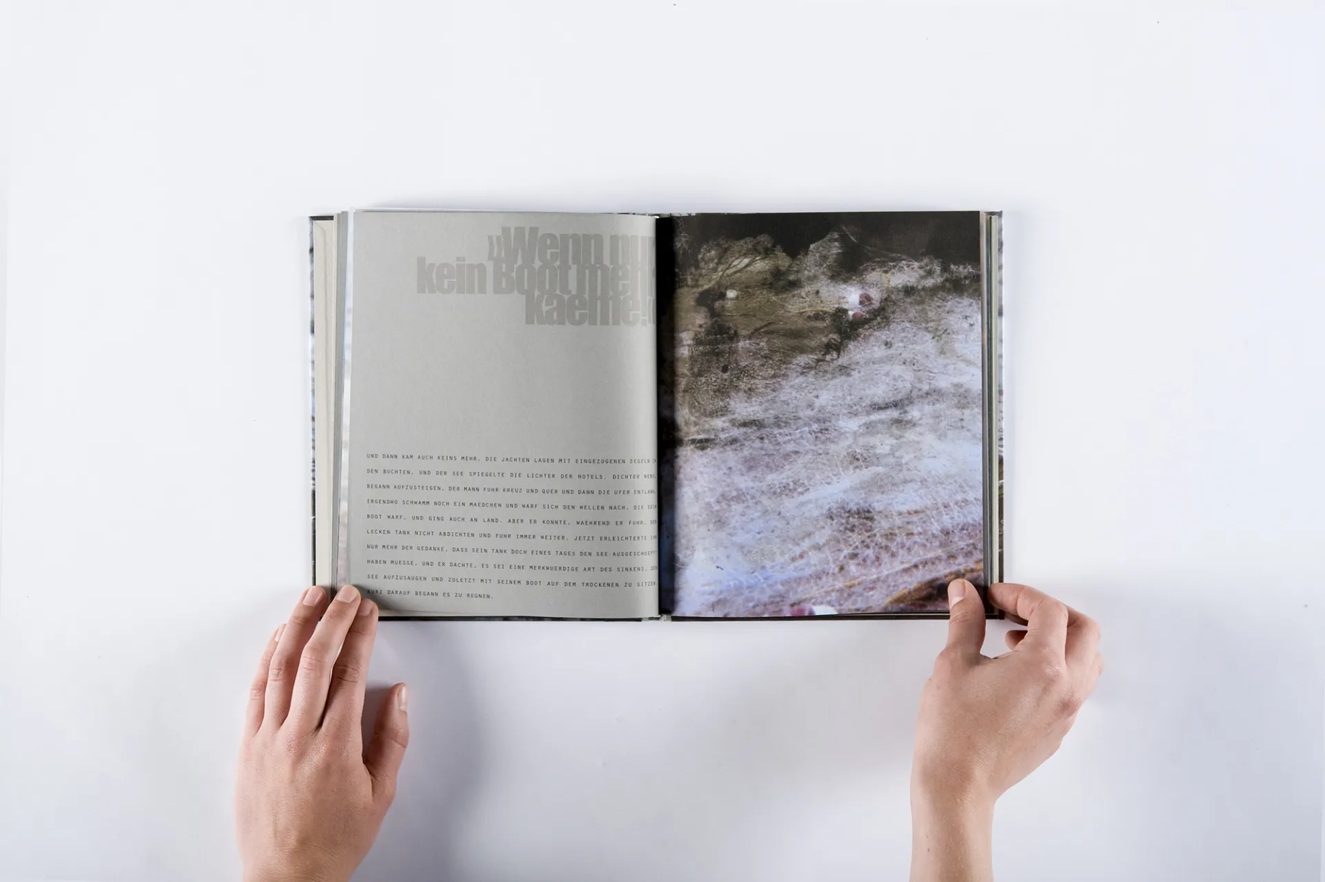 In this book a story of the narration 'Seegeister' from Ilse Aichinger was transfered in an illustrative way. The weird text tells the story of a man going to a lake with his boat and becomes aware that he is not able to stop his motorboat anymore. For the illustrations I worked with colour transparencies, that were painted on, overlaid and scratched.