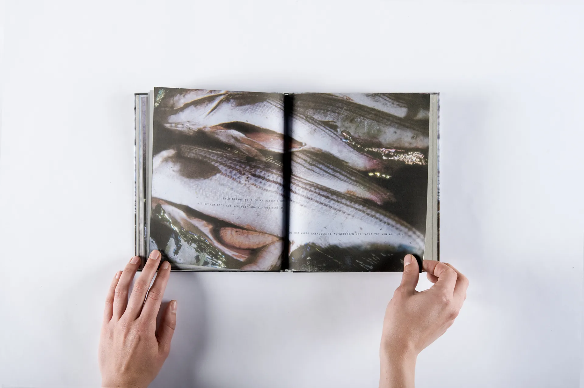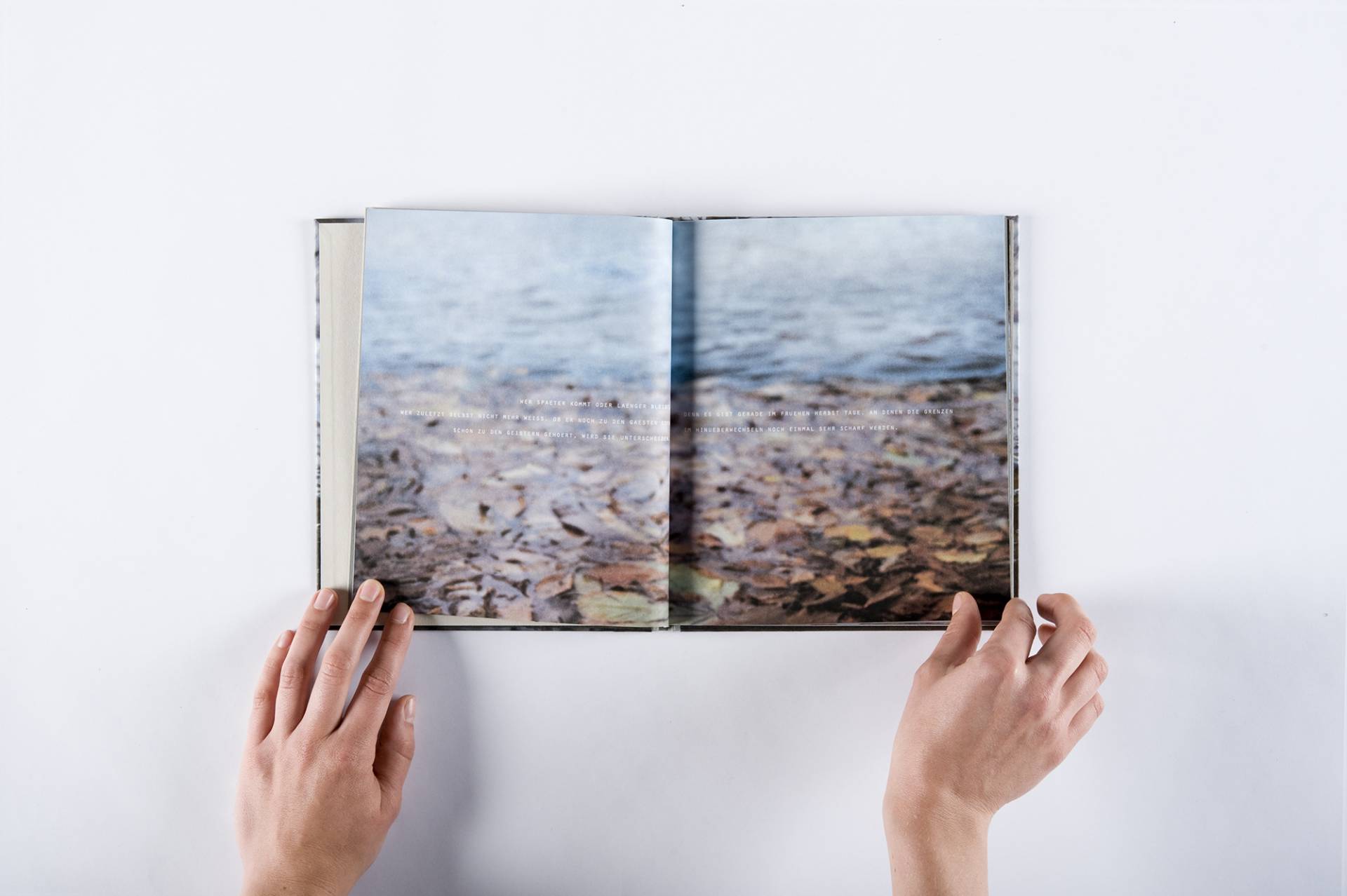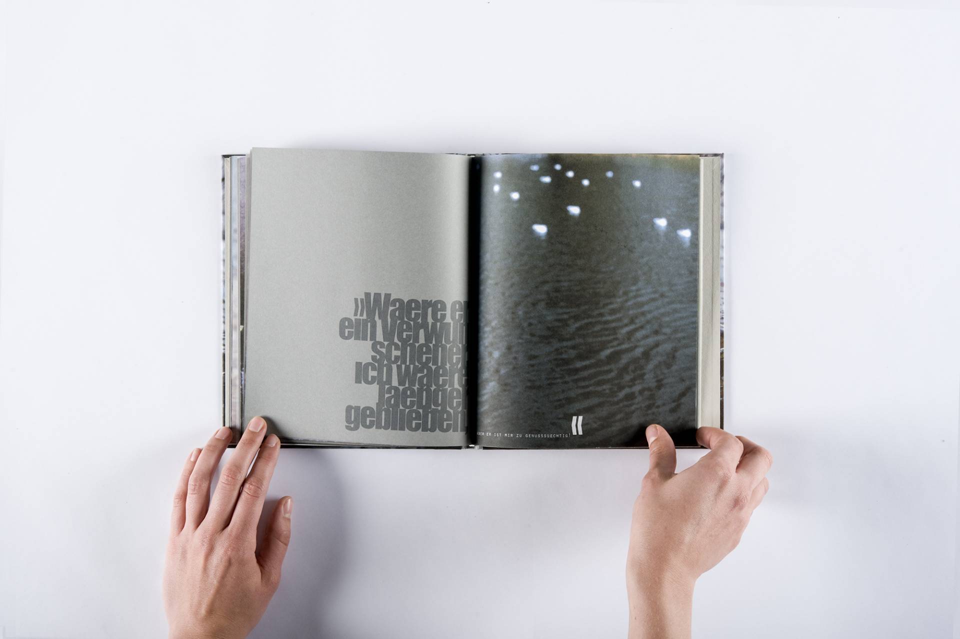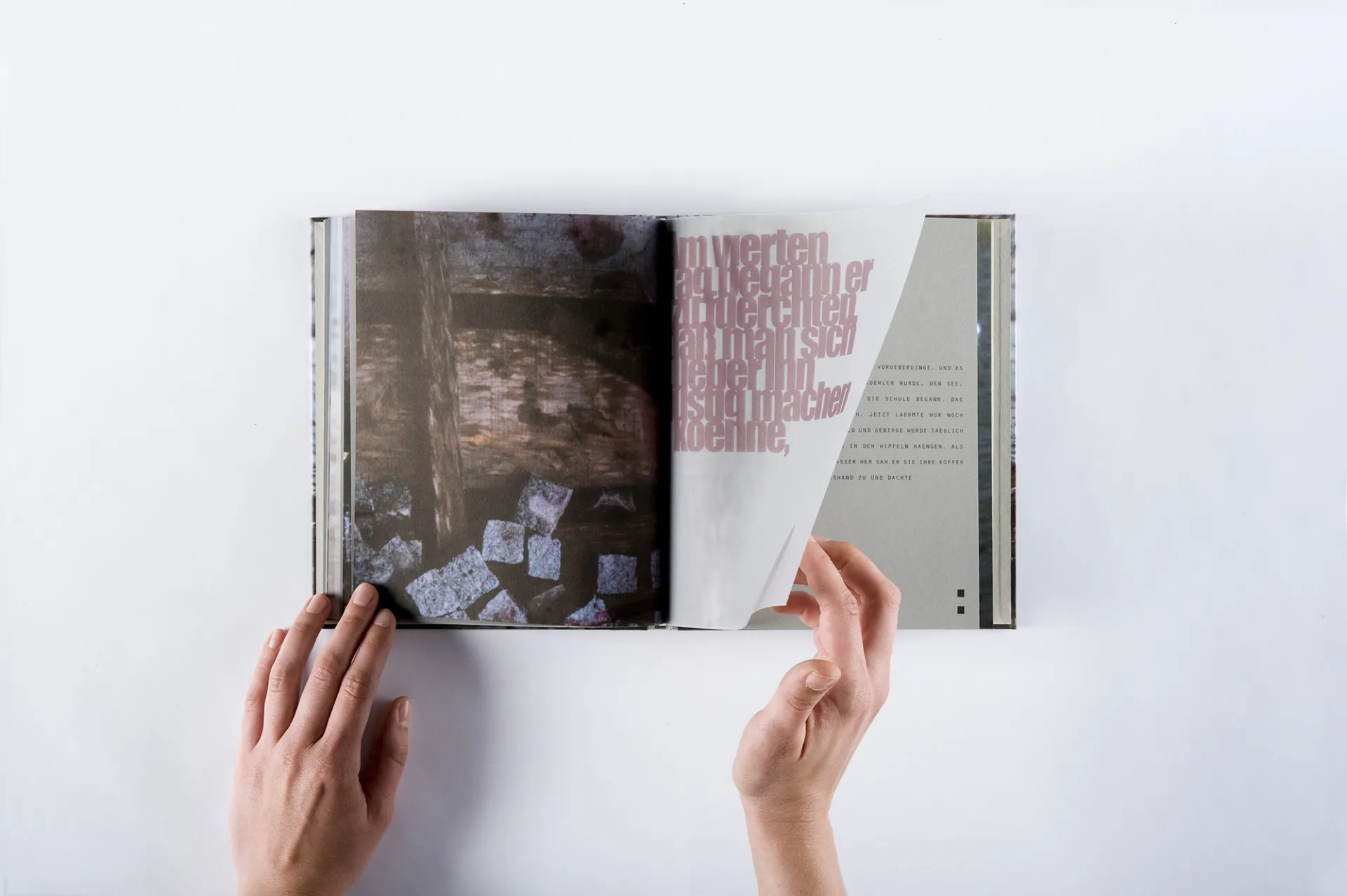 In this book a story of the narration 'Seegeister' from Ilse Aichinger was transfered in an illustrative way. The weird text tells the story of a man going to a lake with his boat and becomes aware that he is not able to stop his motorboat anymore. For the illustrations I worked with colour transparencies, that were painted on, overlaid and scratched.