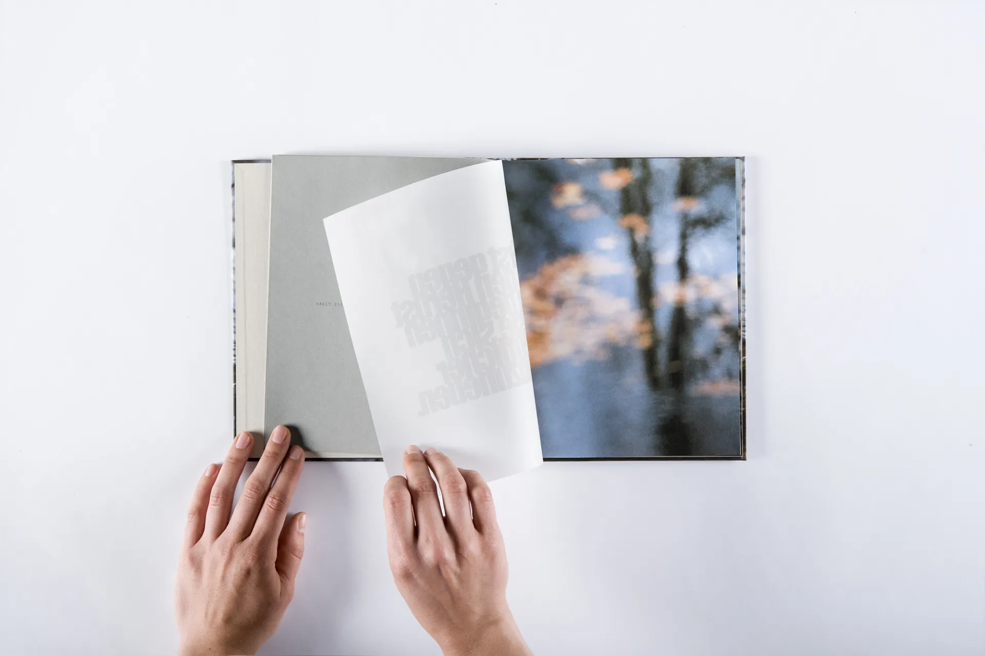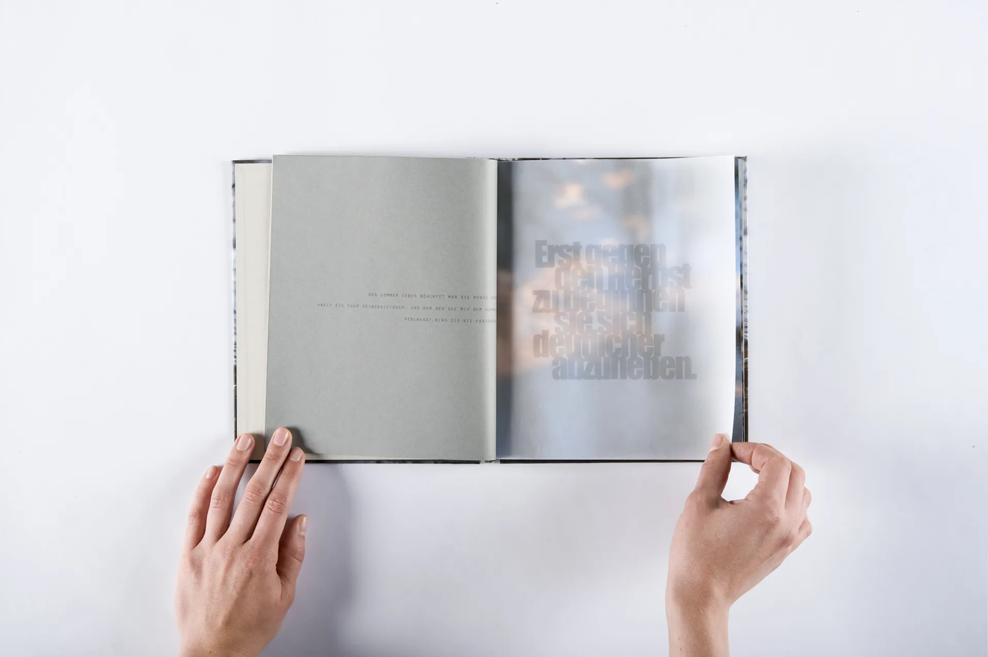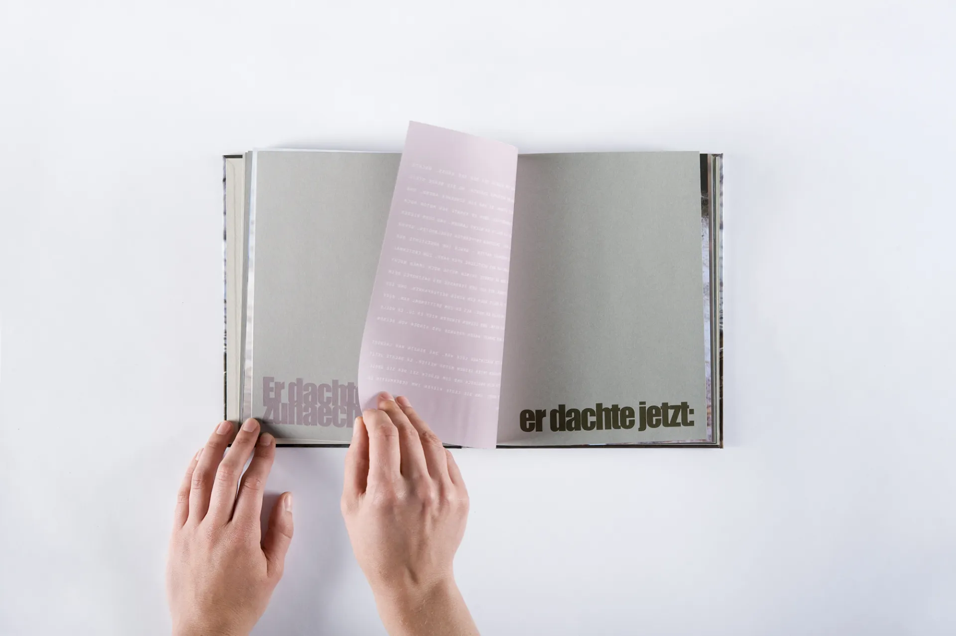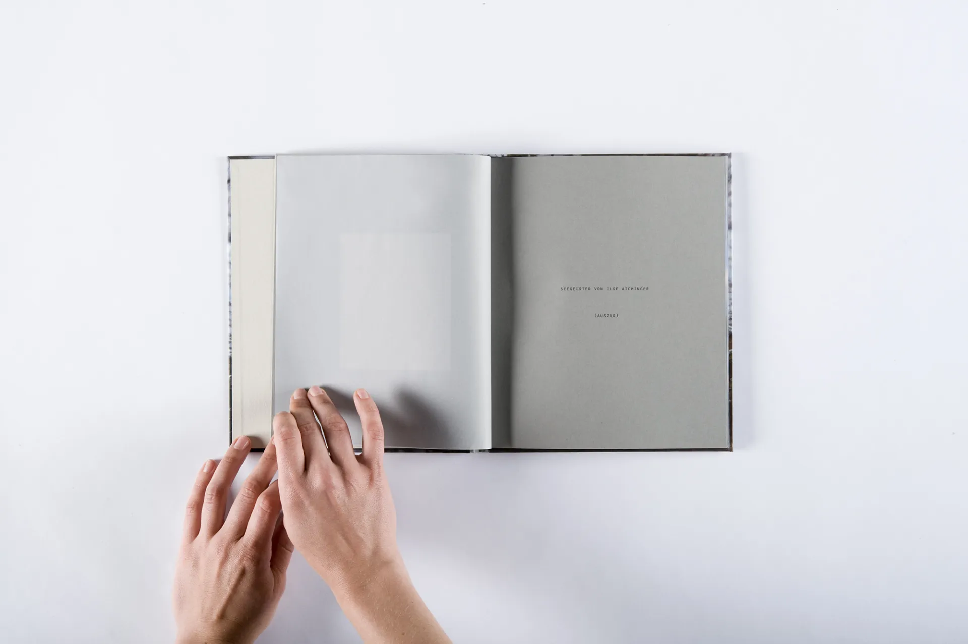 In this book a story of the narration 'Seegeister' from Ilse Aichinger was transfered in an illustrative way. The weird text tells the story of a man going to a lake with his boat and becomes aware that he is not able to stop his motorboat anymore. For the illustrations I worked with colour transparencies, that were painted on, overlaid and scratched.