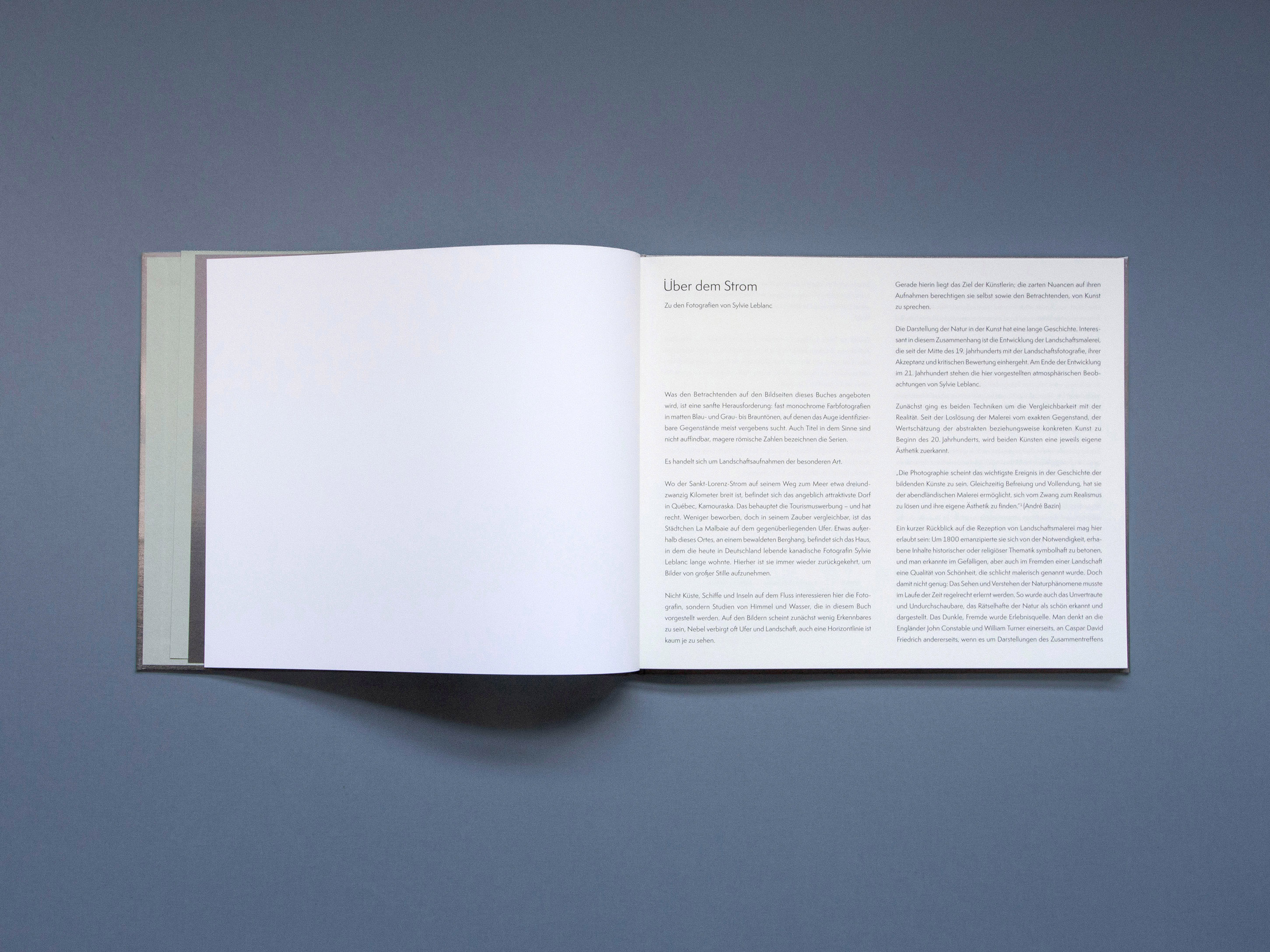 H2O-scapes by Sylvie Leblanc are photographic studies of the sky and the water, created between 2009 and 2023 in La Malbaie, Canada. All fifty-seven photographs were taken from the same location and depict the various physical states of the water in and above the Saint Lawrence River. Sometimes the landscape is entirely shrouded in fog without any visible horizon line; sometimes the outlines of islands are visible. Dramatic cloud formations, drifting ice floes or soft waves: Leblanc's landscape remains the same and yet is presented in a multitude of different ways. Her photographs transform the dynamic play of the water molecules into a moment of stillness—and a space for dreams and contemplation.