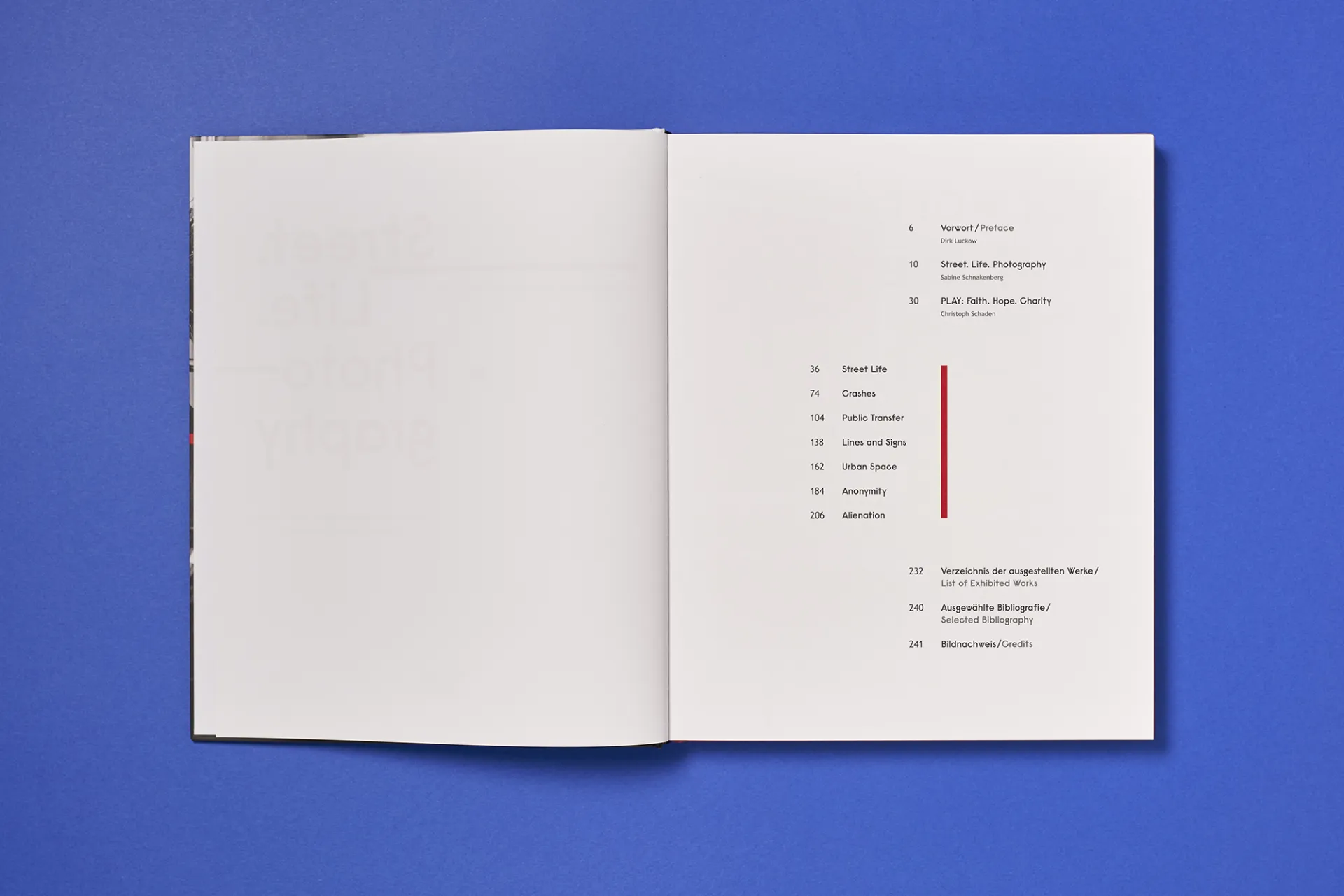 Fleetingly flashed, meticulously observed, packed with intoxicating energy, shock frozen, voyeuristically charged, dramatically overstated, romantically wild, tragic, comical, broodingly absent, and strangely horrific – the street, that »urban space« experienced directly and mundanely as an urban living environment, is by far one of the most scintillating and multifaceted subjects of photography.